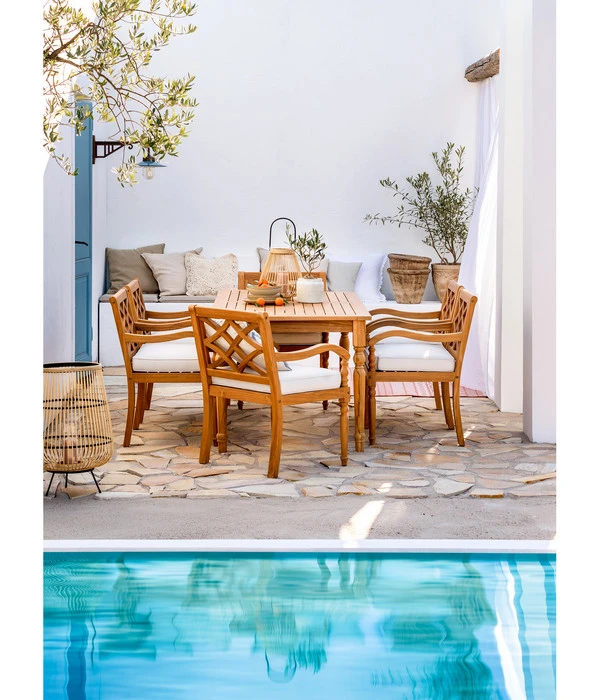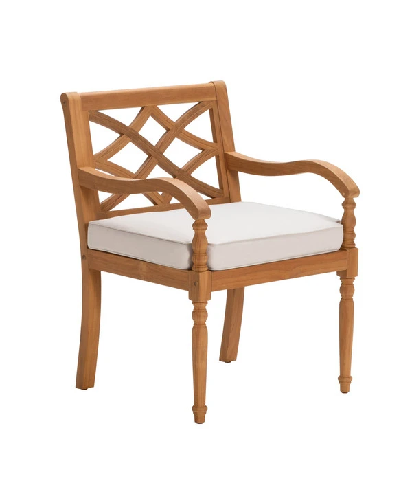 Ihre Terrasse soll Ihr Outdoor-Wohnzimmer werden und dabei stellen Sie an die Möblierung die gleichen Ansprüche wie für den Indoor-Bereich? Schließlich soll auch draußen Ihr Stil zu spüren sein und Sie wollen die gleiche Wohlfühl-Atmosphäre schaffen wie im Haus. Ein Vorhaben, bei dem Sie der Dehner Gartensessel Savona mit seiner ganzen Schönheit und Ausstrahlung unterstützen wird. Denn bestimmt haben Sie gleich erkannt: Dieser Stuhl ist etwas Besonderes. Ganz aus edlem Teakholz gefertigt erfreut er das Auge des Betrachters mit seinen kunstvoll gearbeiteten Streben in der Rückenlehne, mit den sanft geschwungenen Armlehnen und wartet sogar mit gedrechselten Vorderbeinen auf. Schon alleine die Vorstellung, wie gemütlich man auf dem bequemen Kissen sitzen wird, ist verführerisch. Jedoch in nichts zu vergleichen mit dem tatsächlichen Komforterlebnis auf Ihrer Terrasse, wenn der Dehner Gartensessel Savon dort zum stilvollen Platznehmen einlädt. Greifen Sie also gleich zu!
