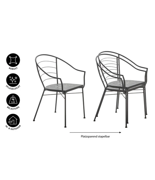 Der Mosaiksessel Madeleine in bekannter Dehner Markenqualität ist nicht nur ein bequem geschnittener Sitzplatz für den Out- und Indoorbereich, sondern glänzt auch mit einem zauberhaften Detail. So zeigt sich die Sitzfläche des Möbelstücks als wunderschöne Mosaikarbeit, die jeden Betrachter sofort für sich einnimmt. Dank des aus hochwertigem Eisen gefertigten Gestells ist der Gartensessel robust und weist eine hohe Tragkraft auf. Bei guter Pflege kann der Stuhl im Außenbereich plaziert werden, wo er durch seine Langelbigkeit und Robustheit überzeugt. Ein besonderes Highlight ist zudem die Stapelfähigkeit des Dehner Mosaiksessels Madeleine. Übereinander gestapelt nimmt er bei Nichtgebrauch nur wenig Platz ein.